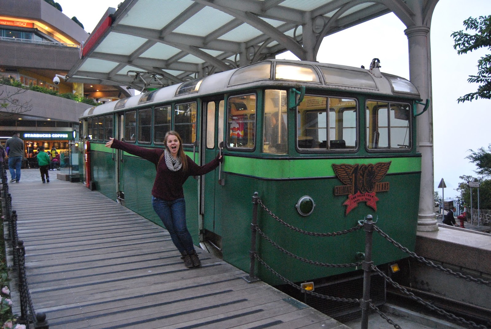 After an afternoon spend hunting the ladies market for souvenirs, we took the subway under the bay to the island of Hong Kong. The central subway station emerges in a beautiful garden square surrounded by skyscrapers. From there, it was about a 5 minute walk through the weaving walk ways above the busy streets to our next destination: The Peak Tram.